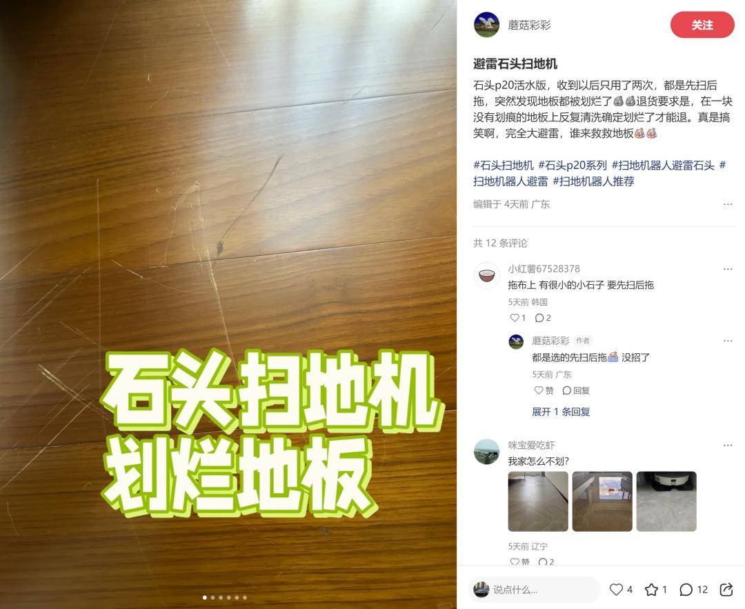 這場個案背后,是社交平臺上鋪天蓋地的同類投訴。在小紅書等平臺搜索“石頭掃地機 劃傷”,大量用戶曬出瓷磚、木地板被刮出刀割般痕跡的照片。從P10系列到P20系列,多款主力機型均涉及此類問題,用戶描述中“避雷”“天塌了”“刮地收割器”等詞匯頻繁出現。更值得注意的是,這些劃痕多發生在機器旋轉拖地時,且一旦出現便無法修復,暴露出可能存在的系統性設計缺陷。