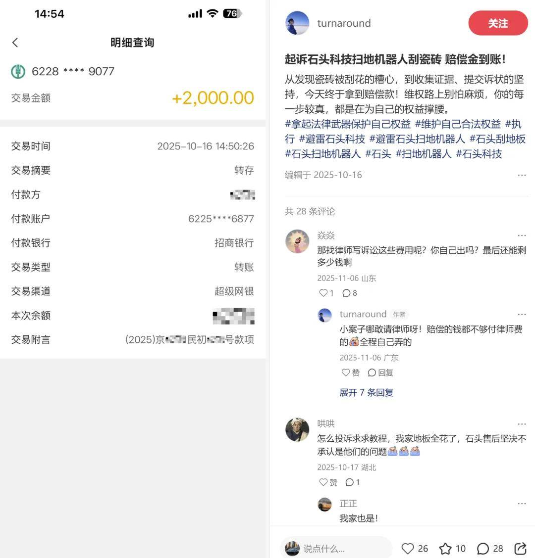 戴先生的維權之路充滿波折。面對用戶質疑,石頭科技客服始終以“產品經過嚴格測試”為由拒絕擔責,甚至以“測試報告屬商業機密”為由拒絕提供相關證明。在無人上門檢測、訴求被擱置的情況下,戴先生通過連續47分鐘跟拍機器工作、記錄剮蹭聲并比對劃痕的方式,完成了關鍵證據鏈的構建。法院二審認定,石頭科技未能證明產品無缺陷,而戴先生提供的視頻證據充分證明了旋轉拖地功能與劃痕之間的因果關系。