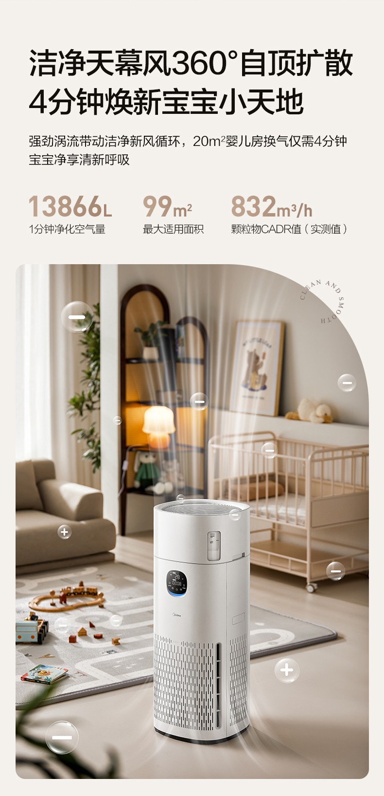 顆粒物CADR值飆升至 832m3/h,1分鐘凈化空氣量達13866L,最大適用面積高達 99㎡,輕松覆蓋大戶型。采用 360°環形風道和潔凈天幕風自頂擴散設計,空氣從四周全方位均勻送出。20㎡的臥室僅需 4分鐘就能完成一次全換氣,徹底解決角落甲醛堆積問題。