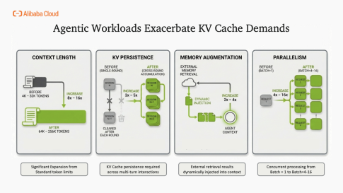 當前,KV Cache 已廣泛應用于系統提示詞復用、多輪對話記憶、長文檔檢索及多模態處理等場景,成為提升生產效能的關鍵。隨著自主智能體時代到來,其需求呈指數級增長:上下文長度從4K擴展至256K tokens、跨輪次緩存持久化、RAG動態注入外部知識、高并發批處理,四大維度疊加使內存壓力激增8-16倍。