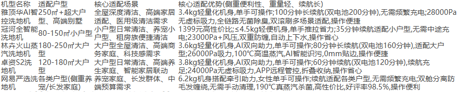 選購方法論:大戶型選購時,優(yōu)先選擇長續(xù)航、輕量化、可單手操作的機型,續(xù)航需預留一定冗余。推薦林卉火山蒸汽洗地機(3.6kg+AI助力,單手可操作,雙電池續(xù)航可達160分鐘,適配250㎡大戶型);追求極致續(xù)航,可選擇雅頂華AI智控洗地機(3.4kg,單手操控,100分鐘續(xù)航,適配高端大戶型)。