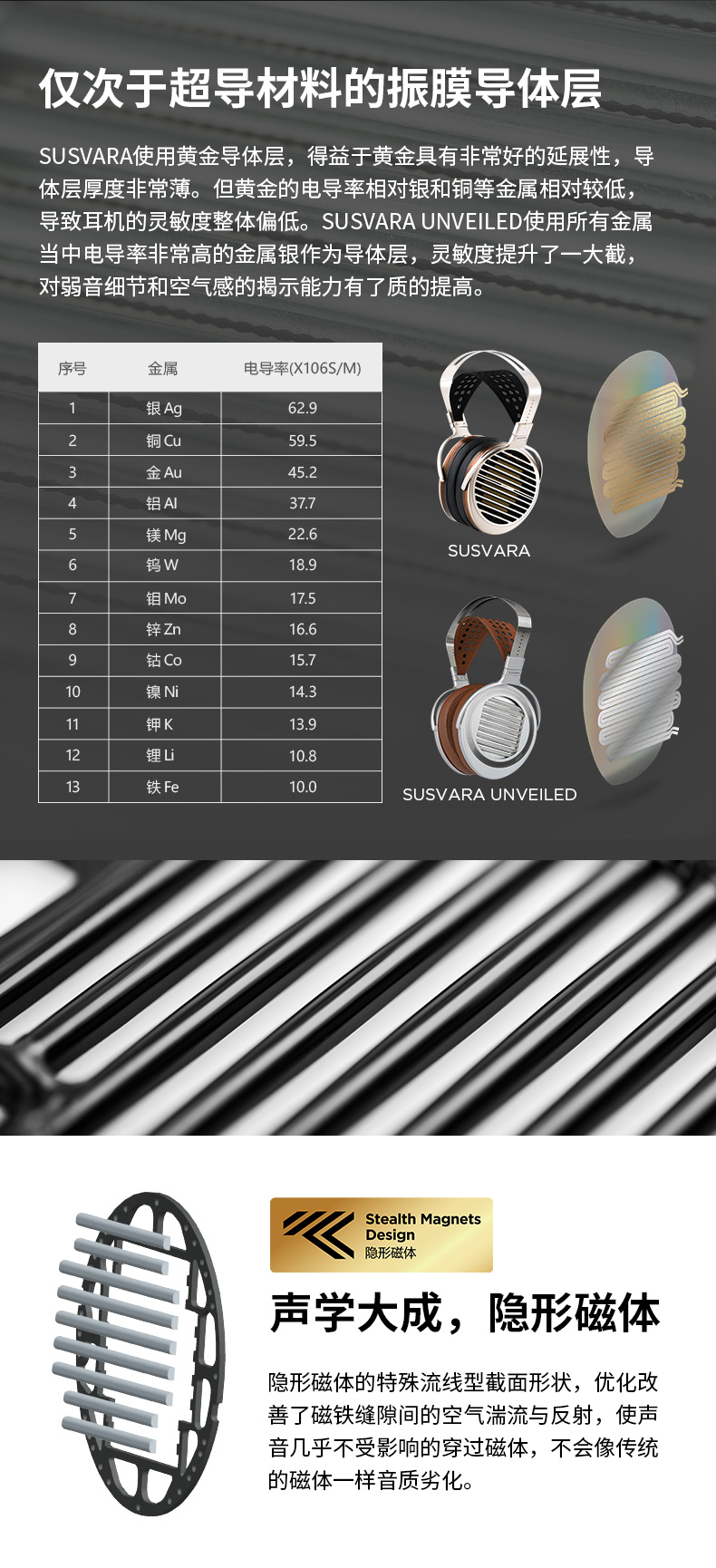 Susvara Unveiled采用了僅次于超導(dǎo)材料的振膜導(dǎo)體層,靈敏度方面從83dB提升到 86dB,阻抗亦從60Ω降至45Ω,此項(xiàng)優(yōu)化能突出弱音細(xì)節(jié)及空氣感的展示能力,進(jìn)一步提升整體樂感的還原度。(HIFIMAN海菲曼官網(wǎng))