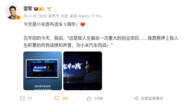 小米創始人雷軍近日發文,紀念小米官宣造車五周年。回溯至2021年3月30日,雷軍正式宣布小米進軍汽車領域,并擲地有聲地表示:“這是我人生最后一次重大的創業項目……我愿意押上我人生積累的所有戰績和聲譽,為小米汽車而戰!”這一宣言,不僅彰顯了雷軍的決心,也標志著小米開啟了全新的征程。