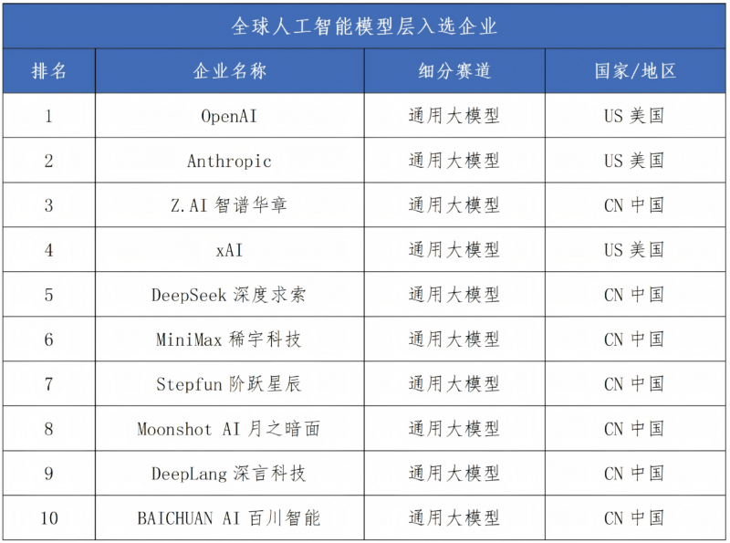 模型層共10家企業(yè)入選,形成中國企業(yè)數(shù)量領(lǐng)先、美國企業(yè)技術(shù)引領(lǐng)的競爭特征。
