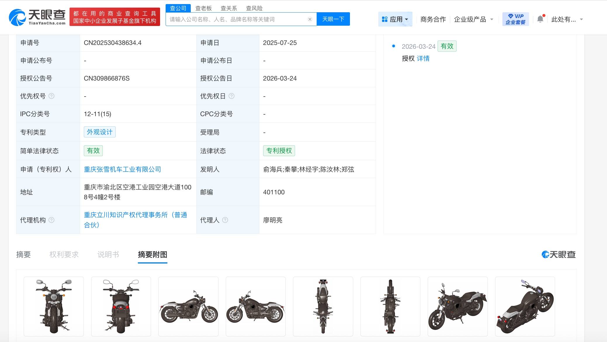 近期,天眼查公布的知識產權信息顯示,張雪機車的關聯企業——重慶張雪機車工業有限公司,在外觀設計領域取得新進展。該公司申請的“摩托車(820RR)”“摩托車(Q700)”“摩托車(M400)”“摩托車(600V)”四項外觀專利獲得授權。這些專利的設計重點在于摩托車的整體形狀,體現了品牌在工業設計上的獨特理念與創新追求。