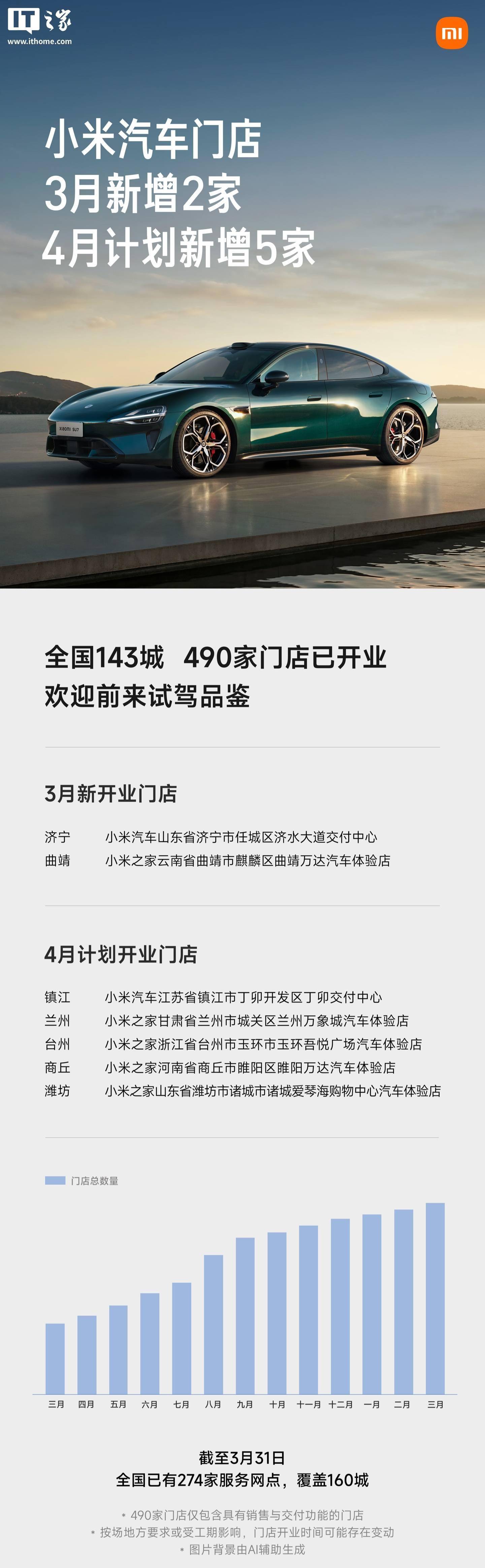 小米汽車近日公布了其線下門店擴張及新車試駕的最新動態。據官方信息,截至3月31日,全國服務網點數量已達274家,覆蓋160個城市,基本實現全國省級行政區的全覆蓋。這一布局為消費者提供了更便捷的購車及售后服務體驗。