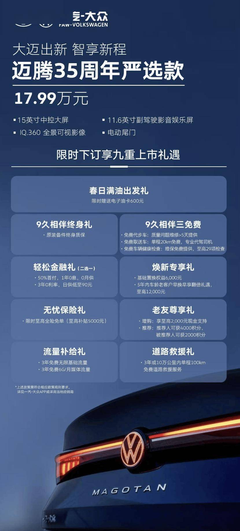 一汽-大眾近日正式推出邁騰“35周年嚴選款”,官方指導價定為17.99萬元。這款特別版車型在外觀設計上融入了矩陣式大燈組,前格柵與燈帶形成貫穿式視覺效果,搭配傳統造型門把手與雙腰線車身設計,車尾采用隱藏式排氣布局并配備貫穿式LED尾燈,電動尾門成為全系標配。