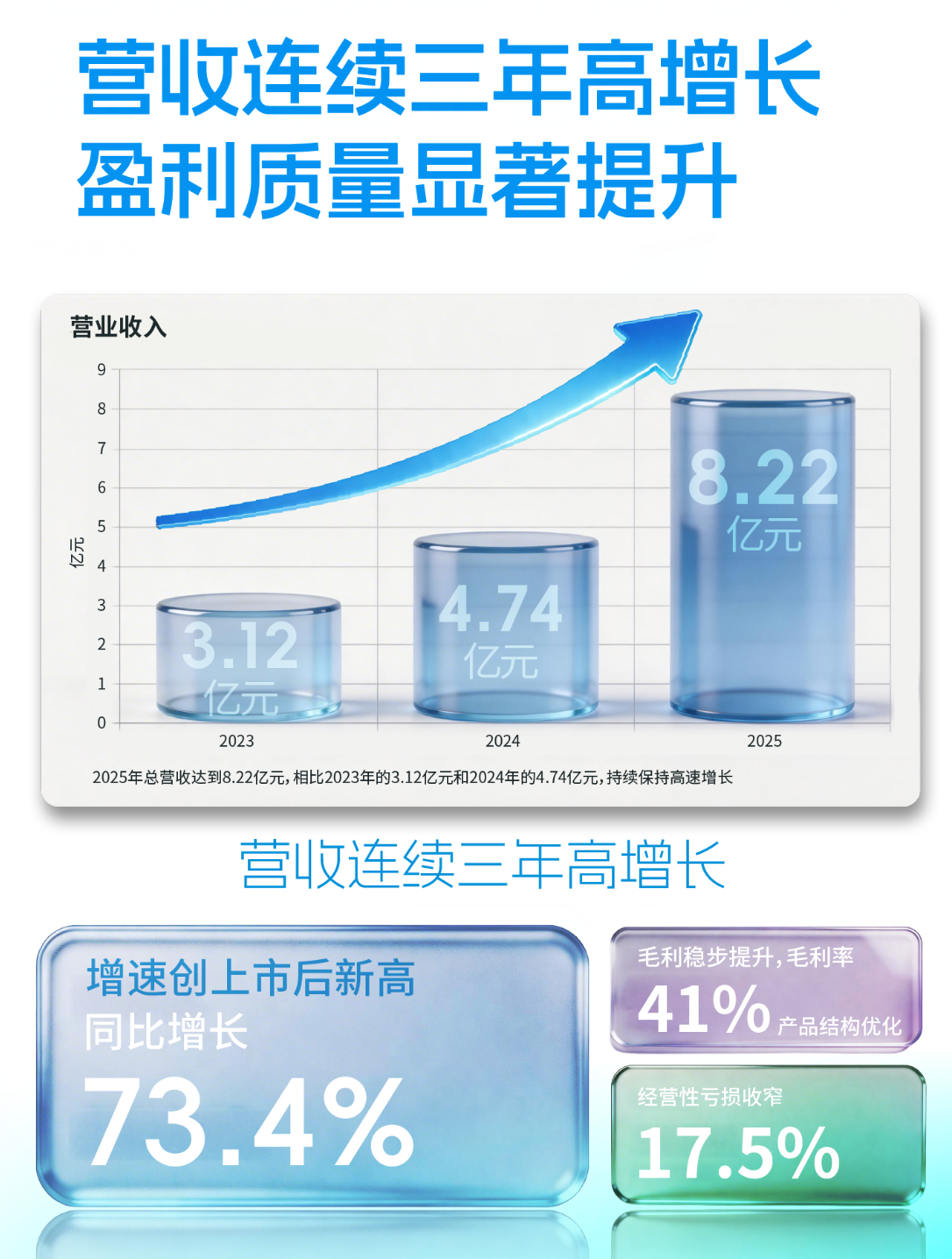 黑芝麻智能?chē)?guó)際控股有限公司(2533.HK)近日公布了2025年全年業(yè)績(jī)報(bào)告,數(shù)據(jù)顯示公司營(yíng)收達(dá)8.22億元,同比增長(zhǎng)73.4%,連續(xù)三年保持強(qiáng)勁增長(zhǎng)勢(shì)頭,增速遠(yuǎn)超行業(yè)平均水平。同期,公司毛利同比增長(zhǎng)71.1%至3.37億元,毛利率穩(wěn)定在41.0%,展現(xiàn)出良好的盈利能力。