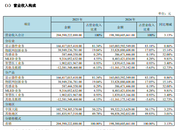 核心顯示器件業(yè)務仍是營收主力,全年貢獻1664.17億元收入,同比增長0.86%。其中LCD面板在電視、顯示器、筆記本電腦等五大主流應用領(lǐng)域及車載市場持續(xù)領(lǐng)跑全球,出貨量穩(wěn)居首位。柔性O(shè)LED面板業(yè)務則保持增長勢頭,在智能手機、可穿戴設(shè)備等高端市場持續(xù)擴大份額。值得關(guān)注的是,物聯(lián)網(wǎng)創(chuàng)新業(yè)務成為新的增長極,該板塊實現(xiàn)營收389.49億元,同比增幅達15.14%,在智慧零售、智慧金融等場景的應用加速落地。