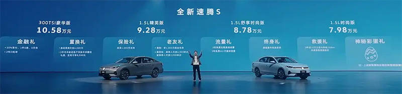 價格策略成為發布會的第一把“利刃”。全新速騰S以7.98萬-10.58萬元的定價,將德系A+級轎車的門檻拉至10萬元以內,直擊年輕首購用戶的預算痛點;全新攬巡兩款配置定價24.69萬與26.69萬元,較老款直降3.3萬元,以“降維打擊”姿態切入大五座SUV市場;邁騰35周年嚴選款則以17.99萬元的定價,搭配15英寸中控屏、副駕娛樂屏等配置,夯實合資B級車的“價值標桿”地位。一汽-大眾通過價格調整,不僅覆蓋了更廣泛的用戶群體,更以“誠意”回應了市場對燃油車性價比的質疑。