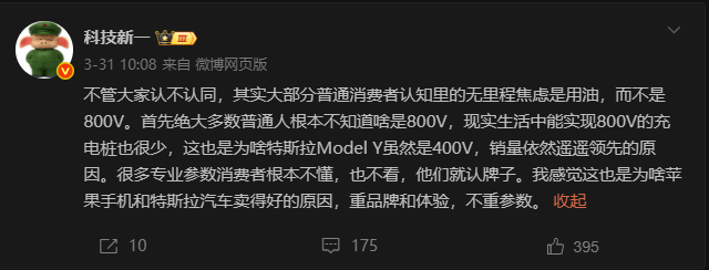 科技博主@科技新一在社交平臺分享觀點稱,多數(shù)消費者對"無里程焦慮"的理解仍停留在燃油車層面,而非電動汽車行業(yè)熱議的800V高壓平臺技術(shù)。他強調(diào),普通用戶既不了解800V的具體含義,也難以接觸到支持該技術(shù)的充電設(shè)施,這解釋了為何采用400V架構(gòu)的特斯拉Model Y仍能保持市場領(lǐng)先地位。