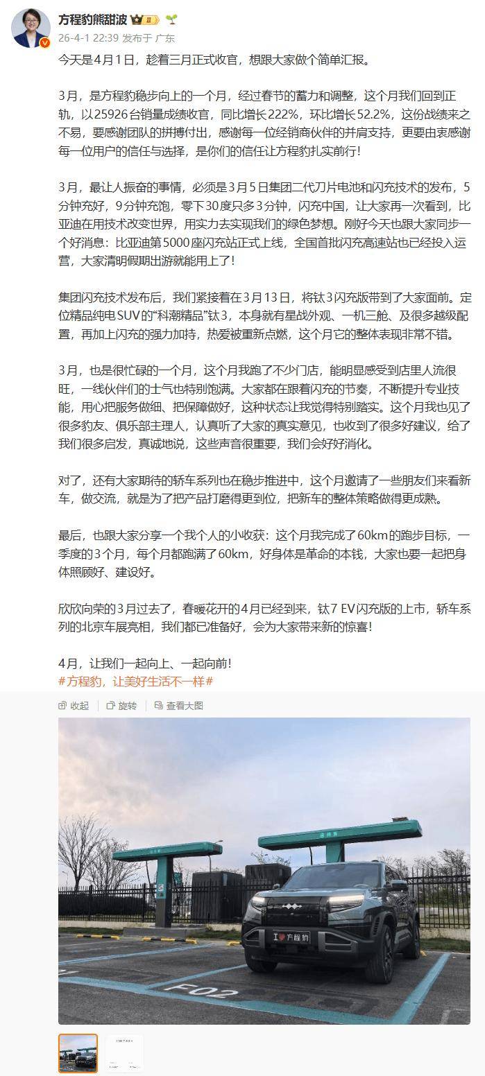 比亞迪方程豹事業部總經理熊甜波近日公布了品牌3月銷售成績,單月銷量達25926臺,同比激增222%,環比提升52.2%。這一數據標志著方程豹在新能源市場持續保持強勁增長態勢,為全年發展奠定良好基礎。