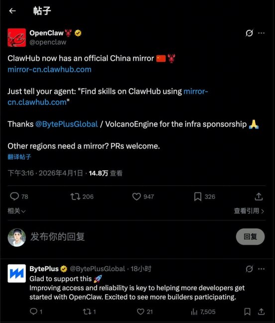OpenClaw在X平臺官宣:在火山引擎的支持下,ClawHub中國鏡像站正式啟動運營!點擊 http://mirror-cn.clawhub.com/ 可以直接跳轉到該鏡像站。