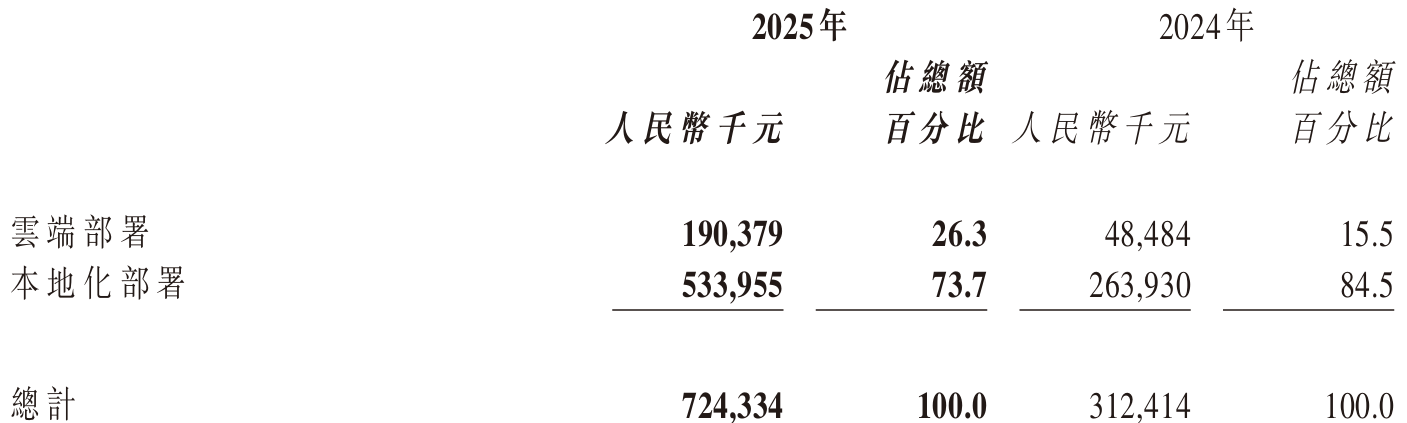 從業(yè)務(wù)結(jié)構(gòu)來看,智譜的云端部署與本地化部署呈現(xiàn)出不同的發(fā)展態(tài)勢。云端部署收入去年達到1.90億元,同比增長293%,主要得益于模型調(diào)用量的顯著增加;而本地化部署作為營收主力,去年貢獻了5.34億元,同比增長102%,但在整體營收中的占比有所下降,從2024年的近85%降至74%。這一變化反映出智譜業(yè)務(wù)結(jié)構(gòu)的優(yōu)化,但尚未迎來根本性轉(zhuǎn)折。
