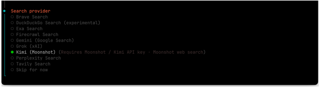 選擇網絡搜索提供商,選擇 Kimi