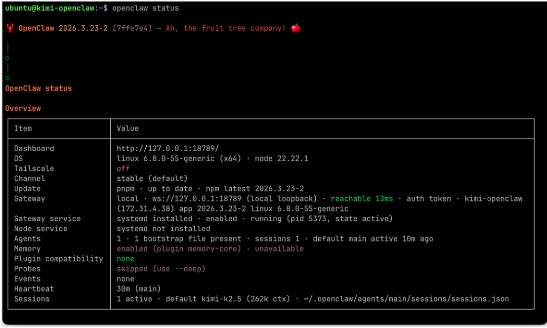 輸入 openclaw status 可查看當前狀態