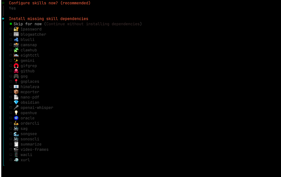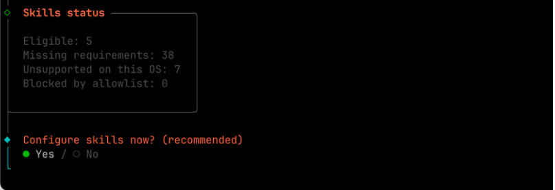 選擇你 OpenClaw 的技能和一些配置,選擇 Yes