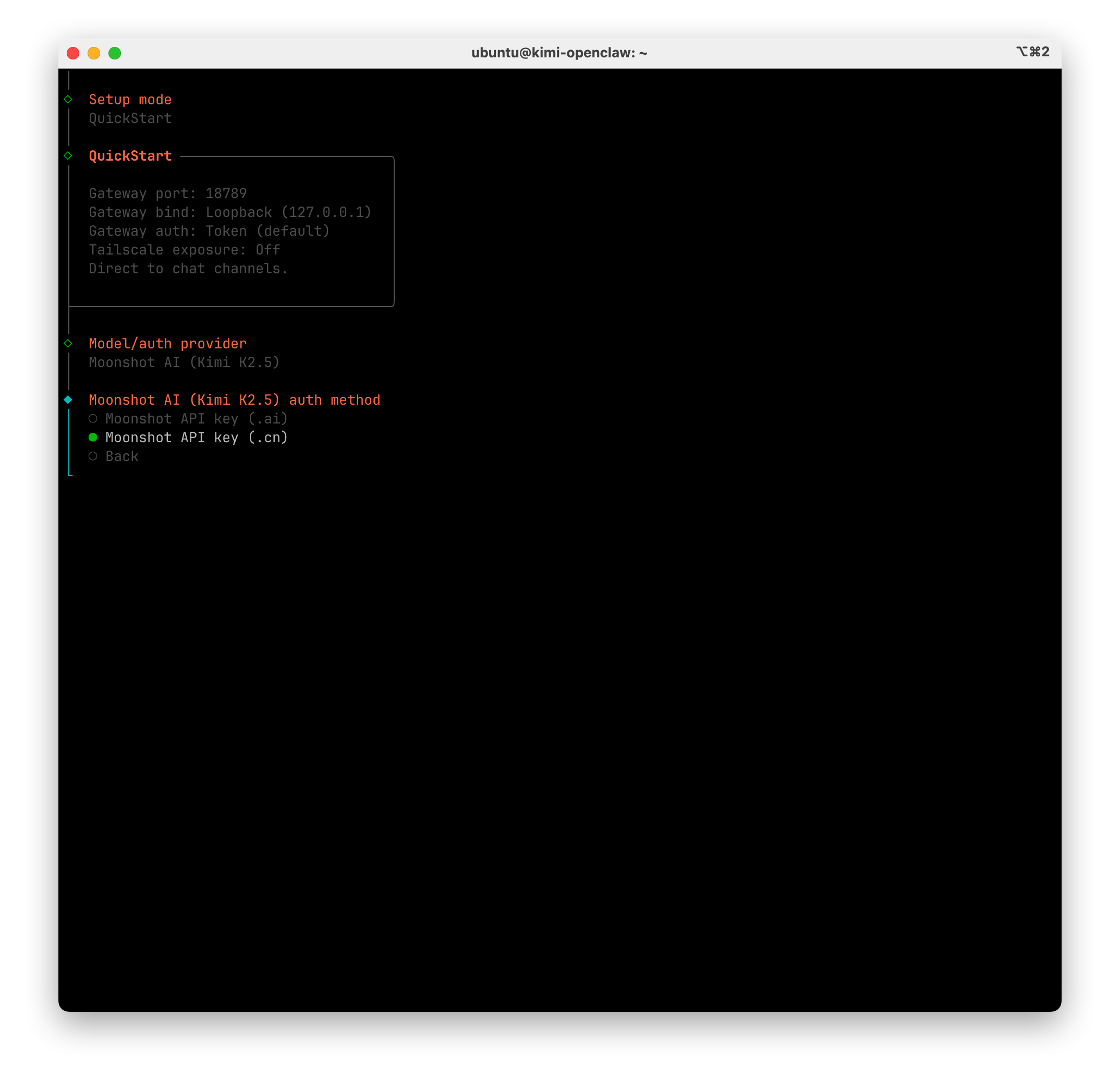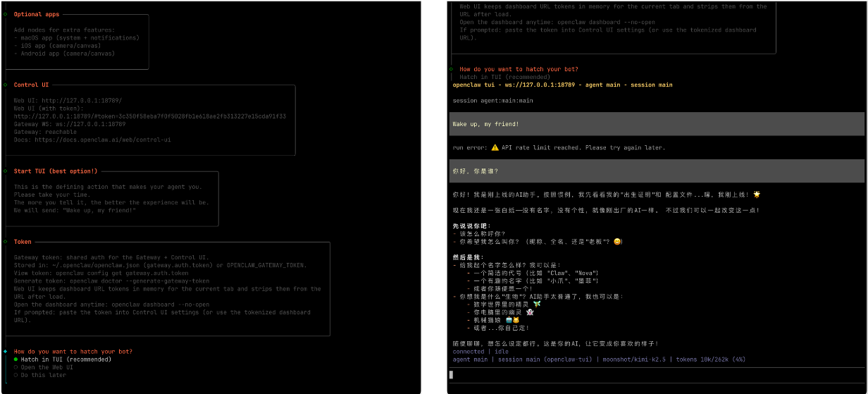將復制的 API Key 貼入終端并敲擊回車,然后選擇 Moonshot/Kimi-K2.5 模型并敲擊回車確認。