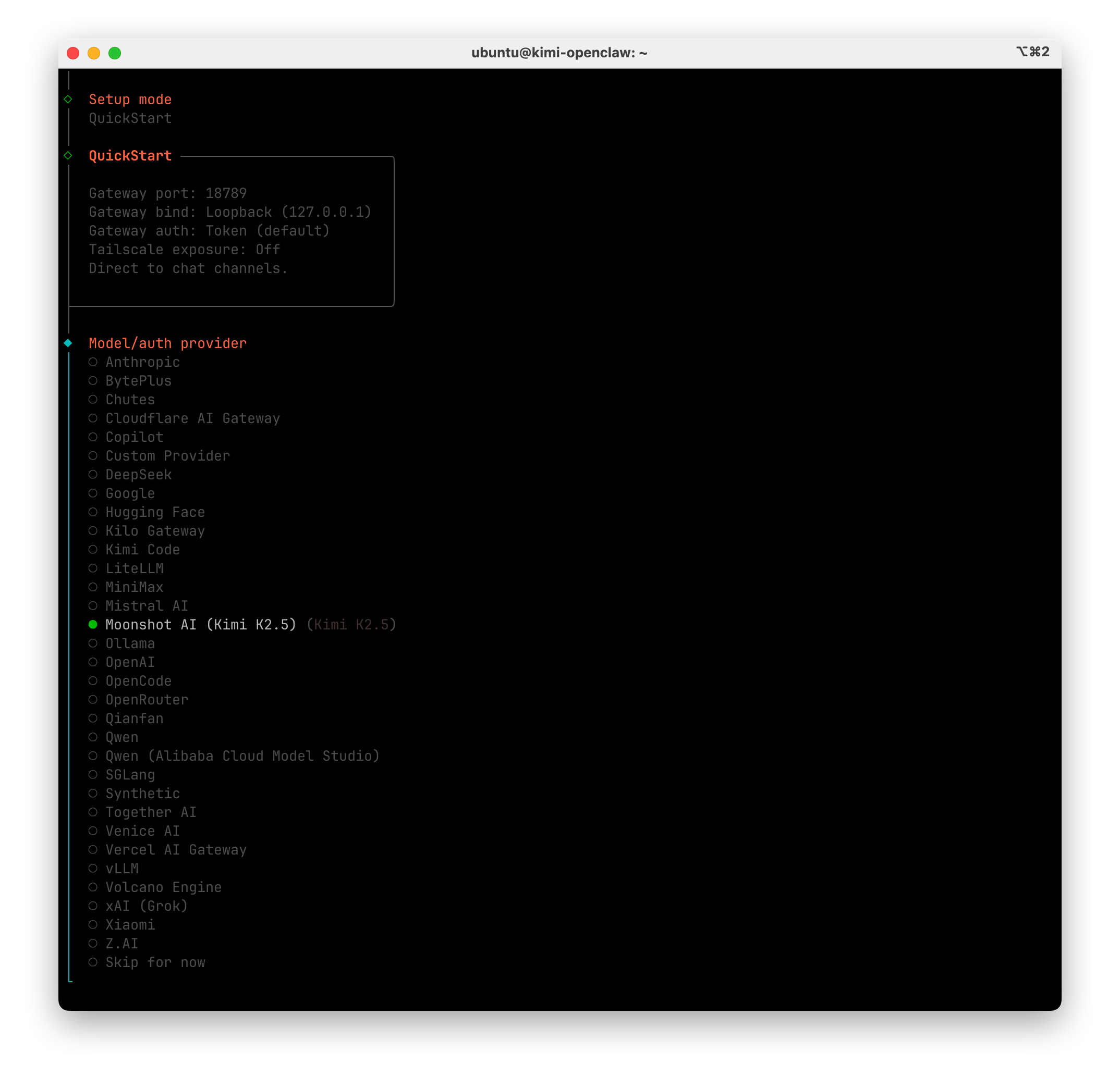 選擇 Model,這里我們按需選擇 OpenClaw 創始人推薦的 Moonshot AI(Kimi K2.5)/ Open AI/ Anthropic 作為基礎模型。(本次選擇的是 Kimi K2.5 進行演示)
