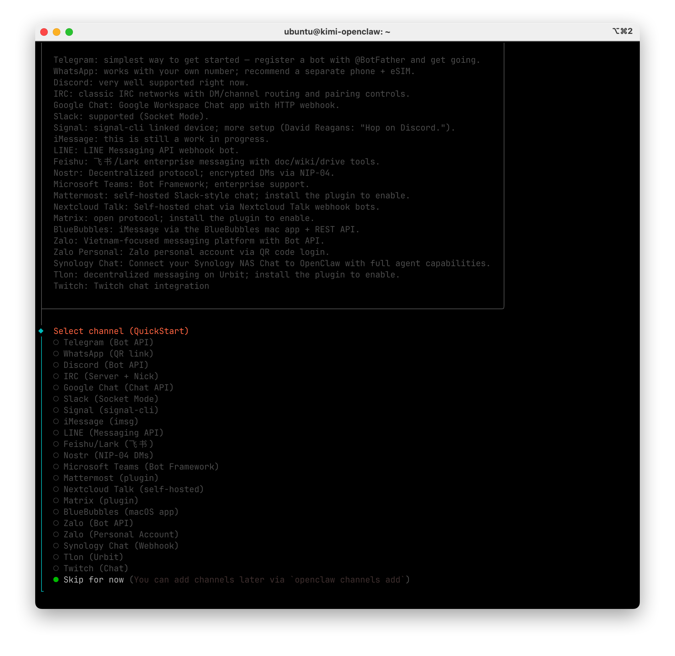 選擇與 OpenClaw 聊天的載體,我們可以先跳過,使用 tui 進行體驗。