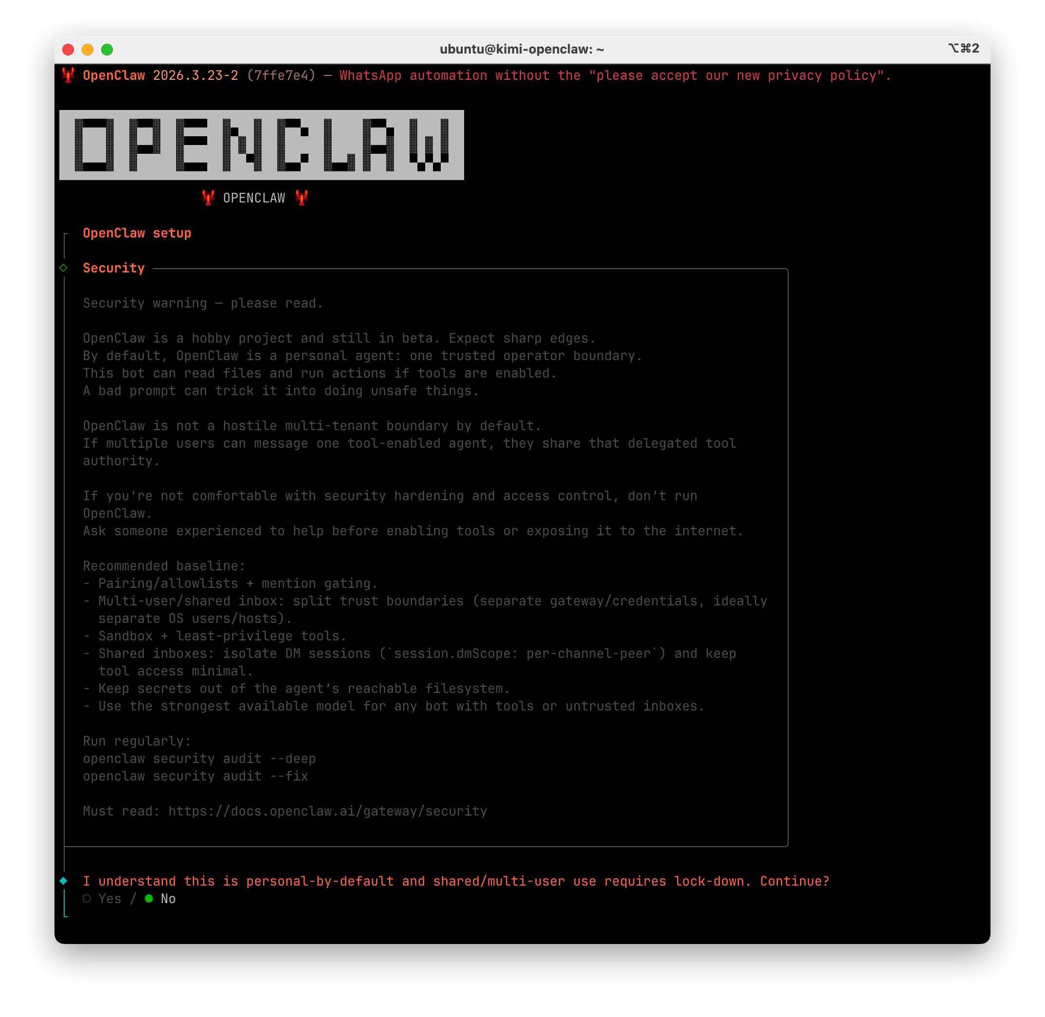 第一步安裝成功后顯示下面畫面,我們選擇 Yes 并回車,表示知道風險。可以用鍵盤方向鍵左右切換 Yes 或 No