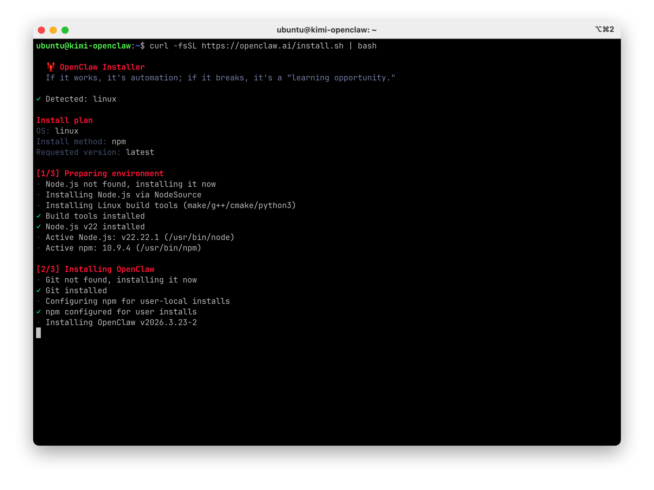 等待腳本自動完成 Node.js 檢測、安裝和 OpenClaw 配置
