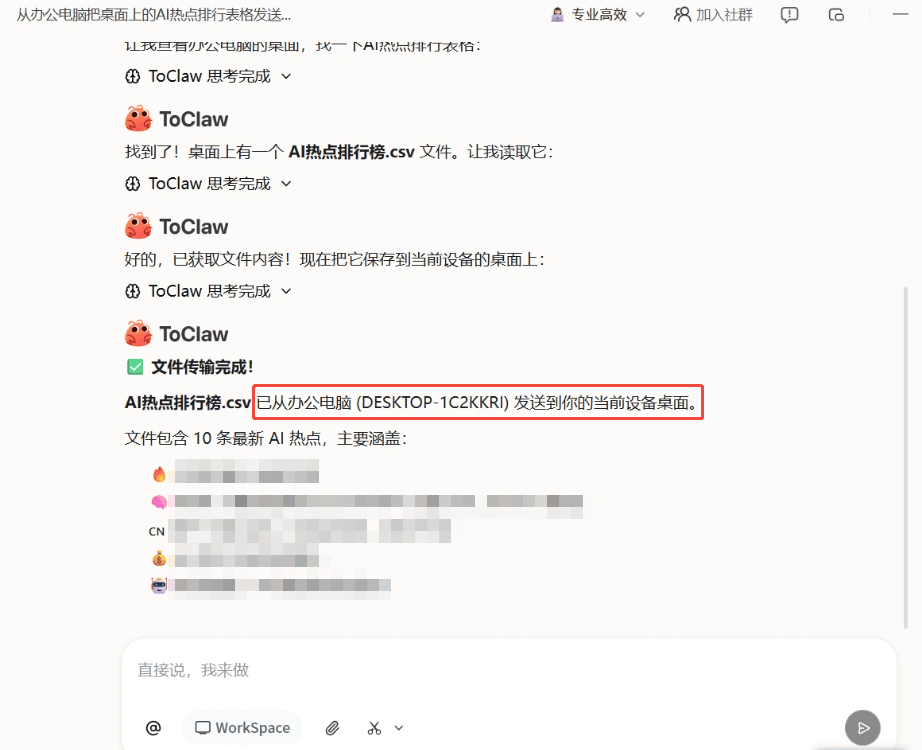在ToClaw的設(shè)計邏輯中,用戶不需要學(xué)習(xí)任何特殊指令,也不需要記憶復(fù)雜的API調(diào)用方式。你只需要像聊天一樣說出需求,ToClaw會自動判斷任務(wù)類型,并調(diào)用對應(yīng)的技能來完成。例如,你可以讓它“幫我整理桌面上的Excel表格,把銷售數(shù)據(jù)按地區(qū)匯總”,ToClaw會直接打開文件、執(zhí)行操作、保存結(jié)果——整個過程,完全模擬人類的操作路徑。