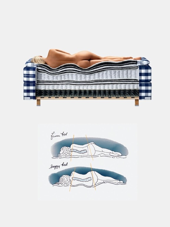 反過來床墊太軟也不行,整個人陷進去,腰椎會被帶著彎曲變形,椎間盤壓力反而更大。