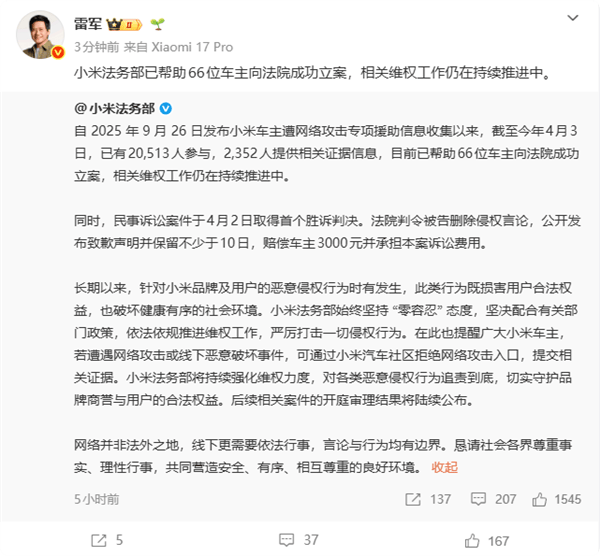 小米法務部近日對外披露,針對部分車主遭遇的網絡惡意攻擊事件,已成功協助66位車主完成法律立案程序,相關維權行動仍在深入推進。截至目前,民事訴訟領域已取得突破性進展——4月2日,首例案件迎來勝訴判決,被告被法院責令刪除侵權內容、公開致歉并保留道歉聲明不少于10日,同時需向車主賠償3000元及承擔訴訟費用。