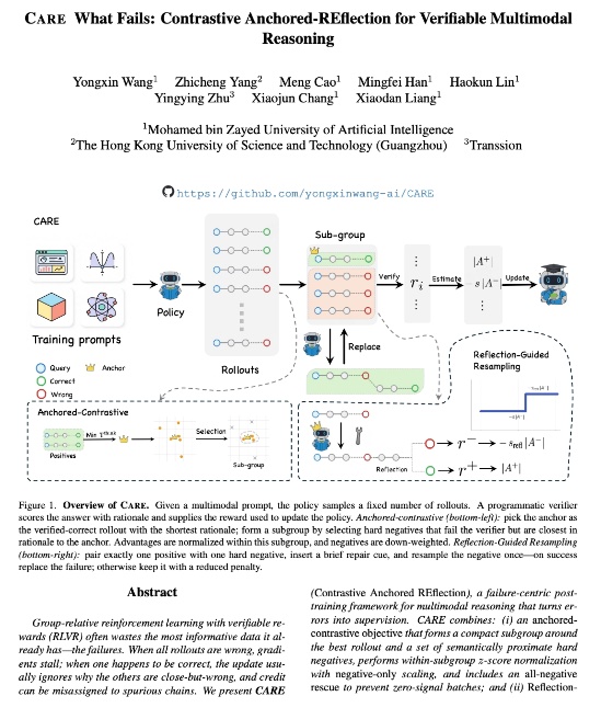 針對這一問題,傳音TEX AI中心與中山大學、MBZUAI團隊合作,開發了CARE(Contrastive Anchored REflection)技術,從訓練機制上對傳統路徑進行了優化。不同于僅以“結果對錯”作為反饋信號的方式,CARE技術將關注點前移到推理過程本身,重點引入“高質量錯誤樣本”——即那些接近正確但存在關鍵步驟偏差的解題路徑。通過將這類樣本與標準解法進行對比分析,并結合反思式重推理機制,模型能夠識別具體錯誤環節,并完成自我修正,從而形成更穩定、連貫的推理能力。在引入反思機制后,模型對復雜問題的二次推理成功率由約10%–19%提升至76.6%,有效增強了面對復雜題目時的穩定性。