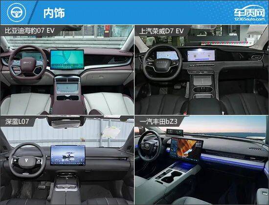 內(nèi)飾布局與智能化配置成為區(qū)分車型檔次的關(guān)鍵。深藍(lán)L07搭載15.6英寸2.5K超高清向日葵屏,支持左右15°偏轉(zhuǎn),配合AR-HUD與零重力座椅,科技體驗(yàn)領(lǐng)先。豐田bZ3通過方向盤加熱與空氣質(zhì)量監(jiān)測(cè)系統(tǒng),強(qiáng)化舒適性表現(xiàn)。榮威D7 EV采用內(nèi)嵌式中控屏,換擋機(jī)構(gòu)為電子式懷擋,整體配置水平中規(guī)中矩。比亞迪海豹07 EV則憑借懸浮式中控屏與電子擋把的組合,平衡了實(shí)用性與設(shè)計(jì)感。