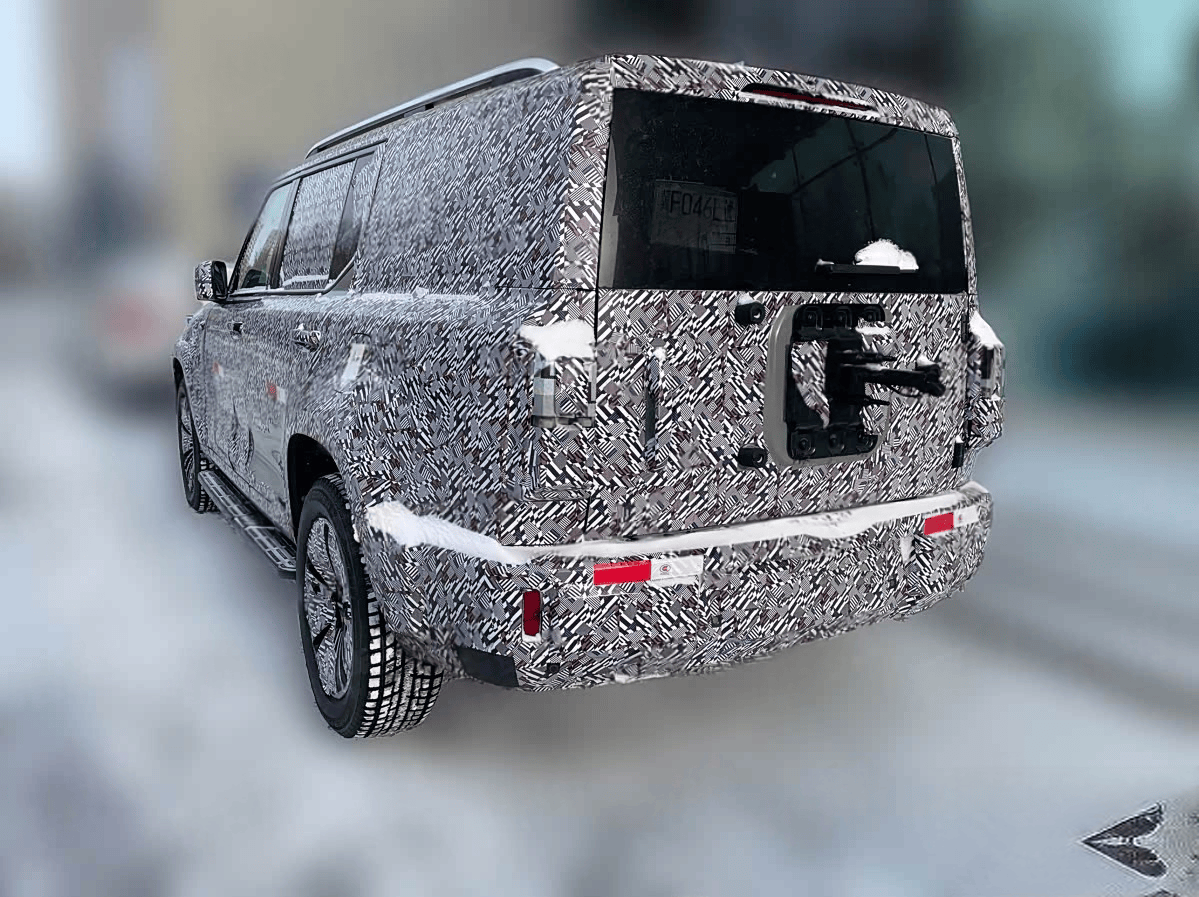 來到車尾,尾門中間預留了外掛備胎接口,結合尾門把手的樣式推測,新車大概率會配備側開式尾門,這種設計在硬派SUV中較為常見,方便取放物品。