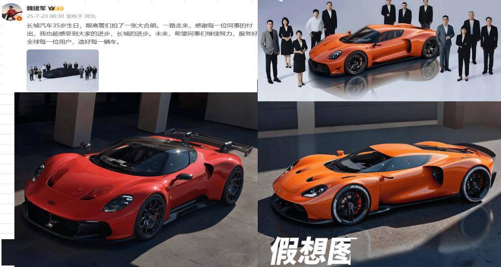 長城汽車的高性能布局早有端倪。2025年7月23日,魏建軍曾在長城汽車35周年慶典上發布一張高管合影,照片中央一輛低趴跑車引發猜測。從設計細節看,該車采用低趴車身、大尺寸腰部進氣口及上翹尾翼,整體輪廓與法拉利SF90等頂級超跑頗具相似之處。據市場傳言,這款對標法拉利SF90的車型將搭載4.0T V8雙渦輪發動機與電機組成的混動系統,最大馬力預計達549Ps,售價或突破百萬元級別。不過從此次直播透露的信息來看,其上市時間已推遲至2027年。