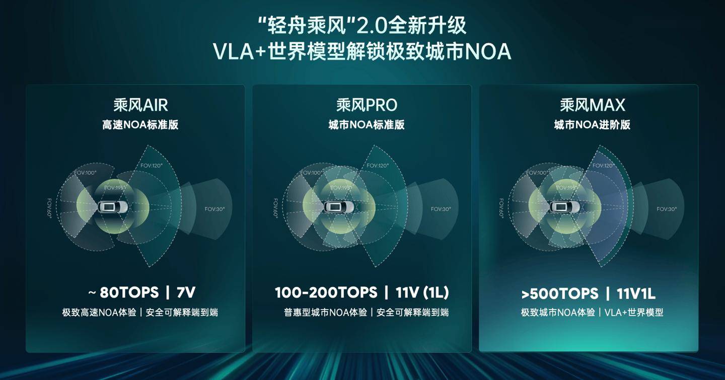 目前,輕舟智航的智能駕駛方案已覆蓋從8萬元到40余萬元的多個價位區(qū)間,滿足不同消費群體的需求。其“輕舟乘風(fēng)”三級產(chǎn)品矩陣已全面落地:乘風(fēng)AIR方案以約80TOPS算力和7V傳感器配置,支持高速NOA功能;乘風(fēng)PRO方案采用100至200TOPS算力及11V或11V1L傳感器組合,實現(xiàn)城市NOA功能;乘風(fēng)MAX方案則憑借超過500TOPS算力和11V1L配置,深度融合VLA與世界模型,提供高階城市NOA服務(wù)。
