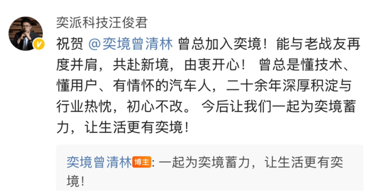 兩位高管在嵐圖時期已有密切合作,汪俊君負責技術研發,曾清林掌管市場銷售,這種搭配為奕境品牌奠定了"技術+市場"的雙輪驅動基礎。汪俊君在社交媒體上表示,與曾清林"再度并肩"是"共赴新境"的開心事,并稱贊對方"懂技術、懂用戶、有情懷"。這種默契源于他們在嵐圖時期共同推動與華為合作的經歷,這段經歷也為奕境品牌的發展積累了寶貴的跨界融合經驗。