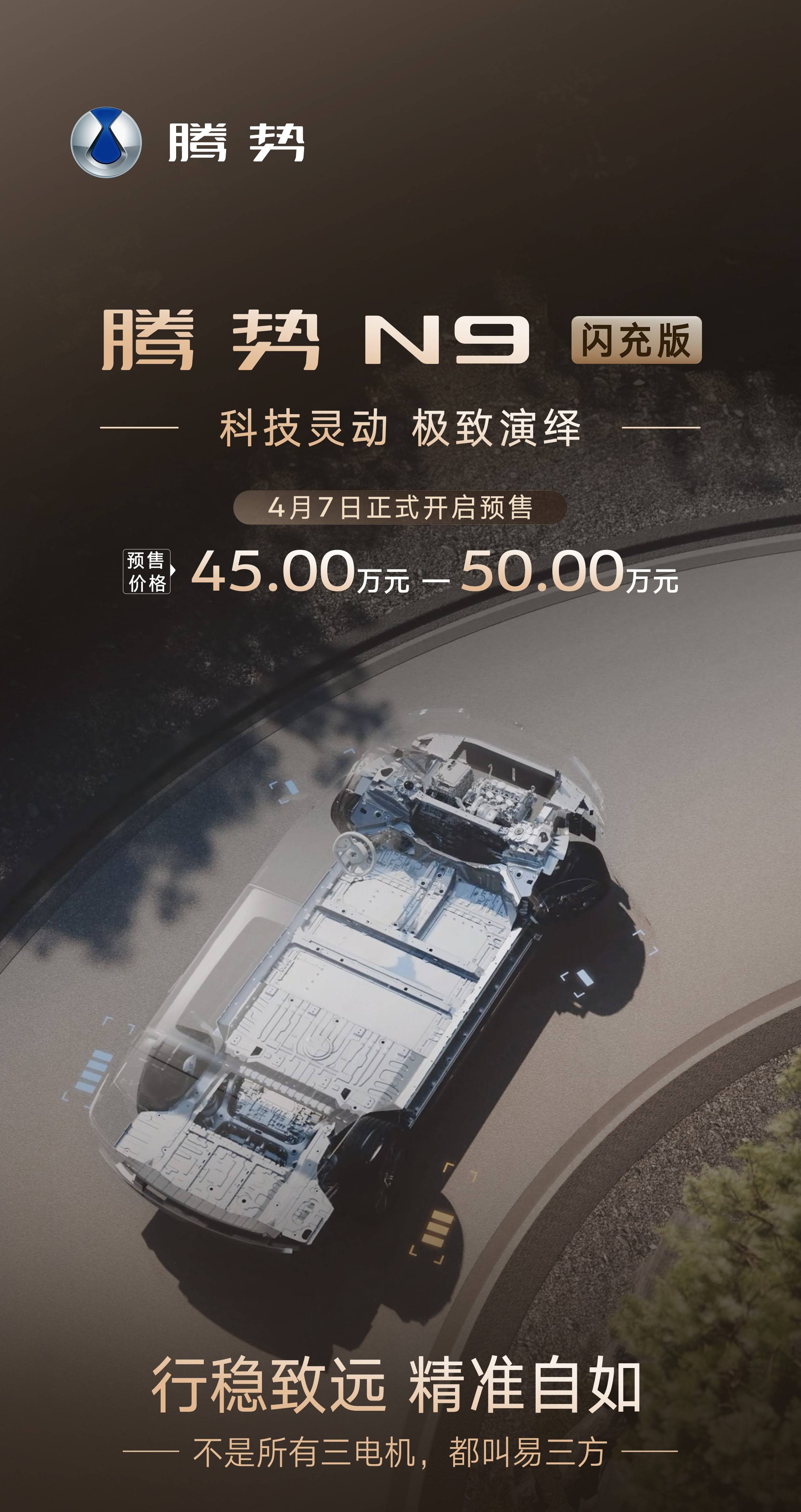 騰勢汽車旗下全新車型——騰勢N9閃充版正式開啟預售,預售價區間為45-50萬元。作為品牌旗艦SUV,新車在動力性能、智能化配置及安全性能方面均實現突破性升級,其中“5分鐘充好、9分鐘充飽”的極速補能技術成為最大亮點。