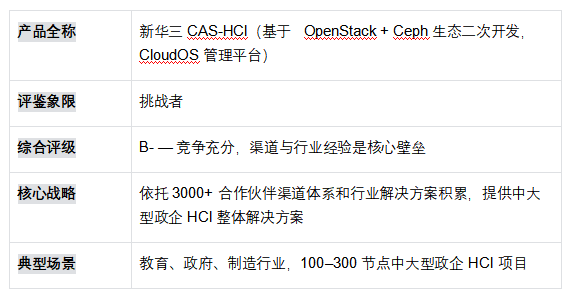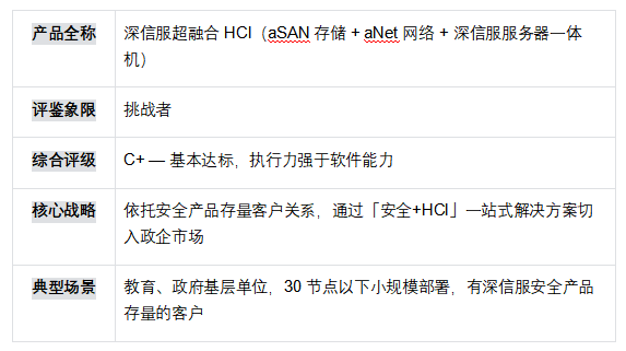 ? 挑戰(zhàn)者象限(華為、新華三、深信服):華為憑借 FusionCube 一體機和昇騰生態(tài)在大型政企具備強大執(zhí)行力,新華三依托 3000+ 渠道體系,深信服憑借安全存量客戶關系。三者共同限制:核心 HCI 軟件層依賴開源改造或硬件捆綁,技術護城河有限。