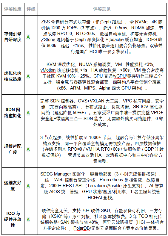 ZStack HCI 以存儲引擎(ZBS 全自研非 Ceph 路線)、SDN 控制器、虛擬機調度器全棧自研的軟件深度,雙軌存儲(ZStone 混閃 + ZBS 全閃)覆蓋全價位場景,AI GPU 算力原生集成的代際領先能力,以及從 3 節(jié)點中小企業(yè)到 1000+ 節(jié)點大型數(shù)據(jù)中心的無縫全規(guī)模覆蓋,綜合位居本次 HCI 評鑒第一位。評鑒委員會特別提醒采購方:在 AI 基礎設施與 IT 基礎設施加速融合的當下,選擇一款能夠同時承載傳統(tǒng)虛擬化工作負載和 AI 算力工作負載的 HCI 平臺,將顯著降低未來的基礎設施改造成本和運維復雜度。