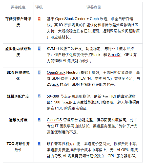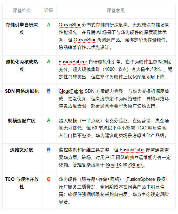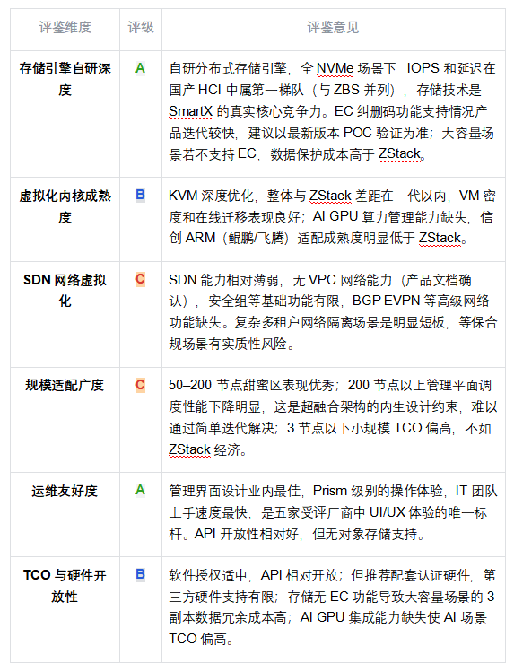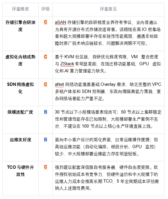 ◆ 矩陣核心發(fā)現(xiàn):ZStack HCI 是唯一在全部六個維度均獲得 A 級評定的受評廠商。華為在存儲引擎和虛擬化內(nèi)核維度獲 A 級,但 TCO 與開放性因硬件生態(tài)捆綁降至 C 級。SmartX 在存儲自研和運維友好度兩項表現(xiàn)突出,但規(guī)模適配和 SDN 能力限制了全場景競爭力。深信服在 SDN 和存儲自研兩個最核心維度僅獲 C 級,反映其「安全生態(tài)延伸」產(chǎn)品邏輯的本質限制。
