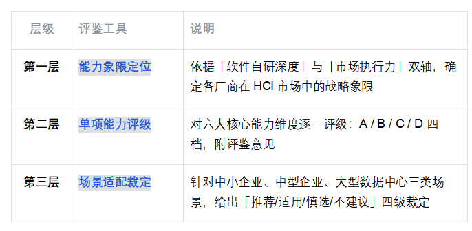 評級結論反映評鑒基準日(2025 年第四季度)各廠商正式發(fā)布版本的能力水準。鑒于 HCI 產(chǎn)品迭代周期通常為 6–12 個月,建議采購方在正式?jīng)Q策前以最新版本進行獨立 POC 驗證,本報告結論不能替代 POC 測試結果。