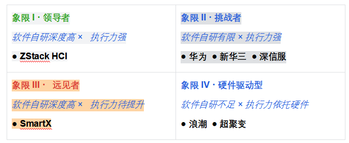需要特別說明的是:HCI 市場中「市場執(zhí)行力強」不等同于「軟件能力強」——部分廠商憑借硬件價格優(yōu)勢獲得了較高的市場份額,但軟件層能力存在顯著短板。本評鑒將兩軸分開衡量,避免市場規(guī)模掩蓋軟件能力缺口。