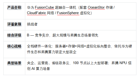 華為 FusionCube 在大型政企和昇騰生態(tài)場景具備無可替代的競爭優(yōu)勢,憑借全棧硬件一體化和原廠服務體系,在超大規(guī)模(千節(jié)點級)部署中保持強勁的市場執(zhí)行力。然而,華為 HCI 的核心競爭邏輯是「硬件鎖定+服務壁壘」,而非軟件定義能力的開放競爭——FusionCube 與華為服務器、OceanStor 存儲、CloudFabric 網(wǎng)絡的深度耦合,在中小規(guī)模場景中產(chǎn)生了顯著的 TCO 溢價,且用戶的硬件采購自由度受到實質性限制。