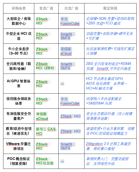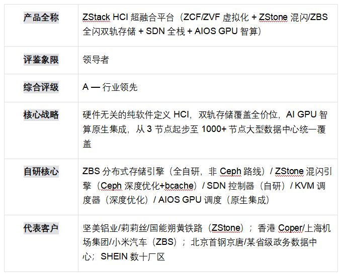 ? 領導者象限(ZStack HCI):軟件定義能力最強,雙軌存儲(ZStone 混閃 + ZBS 全閃)覆蓋全場景,規(guī)模適配從 3 節(jié)點至 1000+ 節(jié)點無縫延伸,AI GPU 智算原生集成是唯一差異化壁壘,阿里云戰(zhàn)略投資背書生態(tài)協(xié)同。