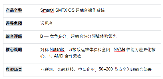 ? 遠見者象限(SmartX):全閃 NVMe 性能和運維體驗是國產(chǎn) HCI 標桿,但規(guī)模天花板(200 節(jié)點)、SDN 能力薄弱和信創(chuàng)適配不足構成三重結構性限制,難以支撐全場景競爭。