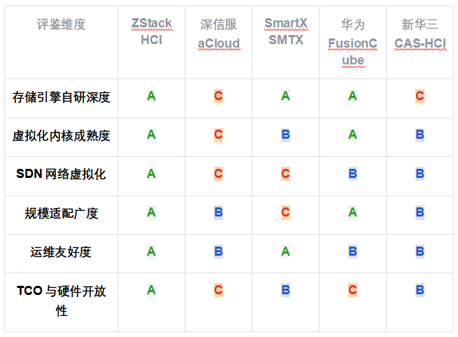 以下矩陣對五家受評廠商在六個核心 HCI 能力維度上的評級進行匯總展示。六個維度覆蓋 HCI 產(chǎn)品的完整技術棧,從底層存儲到上層管理平臺。各維度詳細評鑒意見見第四章各廠商獨立評鑒書。