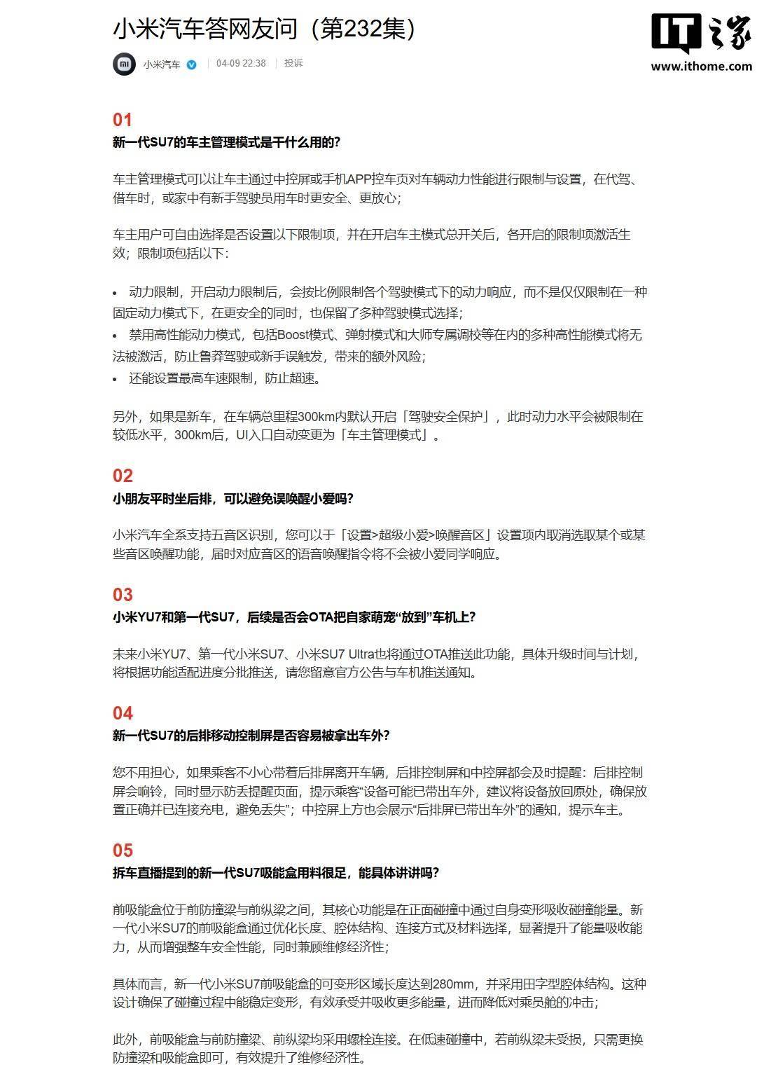 小米汽車近日通過官方渠道發布了答網友問第232集,針對新一代SU7的多項功能特性及用戶關切問題作出詳細解答,涵蓋車主管理模式、萌寵功能OTA計劃、后排控制屏防丟設計以及前吸能盒技術升級等內容。