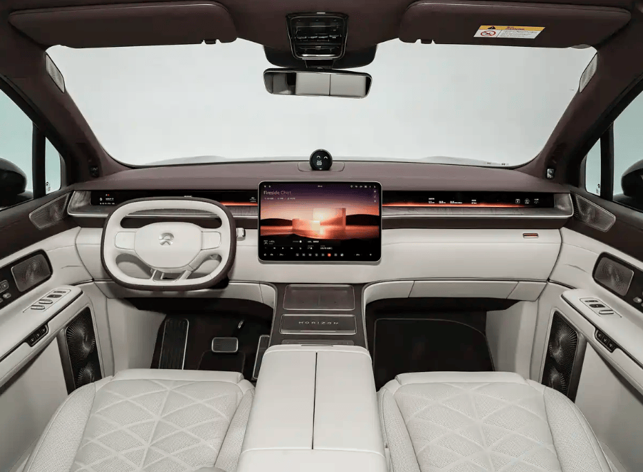 座艙內部延續蔚來家族式設計語言,15.6英寸中控屏與48英寸天際線屏幕構成沉浸式交互界面,橢圓形方向盤搭配Nappa真皮與楓影真木飾板,營造出豪華與科技交融的駕乘環境。六座布局采用2+2+2形式,第二排配備"飛航零重力座椅",集成加熱、通風、按摩功能,并設有電動遮陽簾、閱讀燈及雙娛樂屏。中島版本特別設置中央操控屏與隱藏式小桌板,第三排座椅支持電動調節與加熱功能,配備手動遮陽簾提升舒適性。
