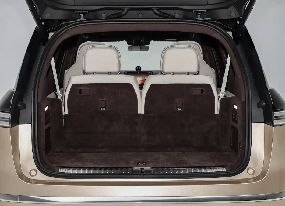 車身設計以極簡主義為核心,純平側窗與隱藏式門把手營造出流暢的視覺效果,23英寸鍛造輪轂搭配電動腳踏板,既彰顯運動氣質又兼顧實用性。翼子板區域創新集成激光雷達與"九曜側翼光階"燈帶,該燈帶可實現迎賓交互與智能駕駛狀態提示功能。車尾采用貫穿式超紅LED燈帶設計,后備箱空間表現突出,常規容積達600升,通過隱藏式儲物區與第三排座椅放倒功能,最大可擴展至1586升。
