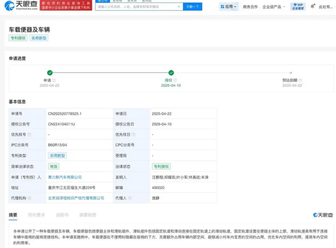 當新能源汽車的競爭從續航、智能駕駛延伸到生活場景,賽力斯再次以“腦洞大開”的創新引發行業關注。近日,國家知識產權局公布的一項專利顯示,賽力斯申請的“車載便器”技術已獲授權,這項被業內稱為“汽車廁所”的裝置,或將重新定義移動空間的便利性邊界。