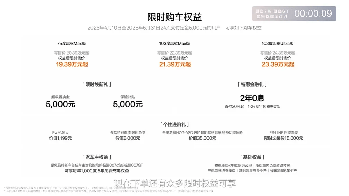 極氪汽車近日宣布,旗下煥新極氪007與極氪007GT正式登陸市場,同時推出極氪001五周年紀念版車型。此次上市的新車共包含3款配置,官方零售價區間為20.39萬至24.39萬元,消費者在享受限時權益后,實際支付價格可下探至19.39萬至23.39萬元。全系車型均升級至900V高壓架構,提供單電機后驅與雙電機四驅兩種動力選擇,其中后驅版電機最大功率達370kW,四驅版綜合功率高達585kW,并標配閉式空氣懸架與高性能運動套裝。